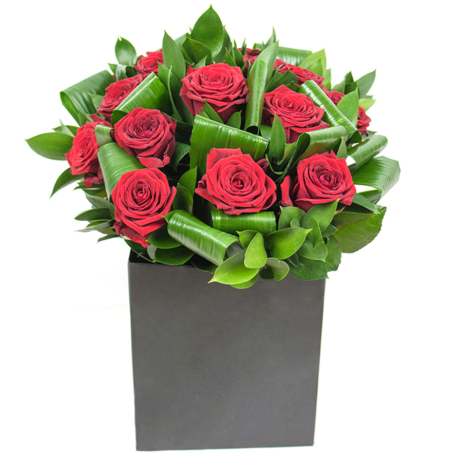 Our exclusive bouquet is a masterpiece, featuring vibrant red roses enhanced by the natural beauty of aspidistra leaves and ruscus. Lovingly arranged by expert florists, this stunning display offers both beauty and longevity, making it the ideal gift or home accent.
